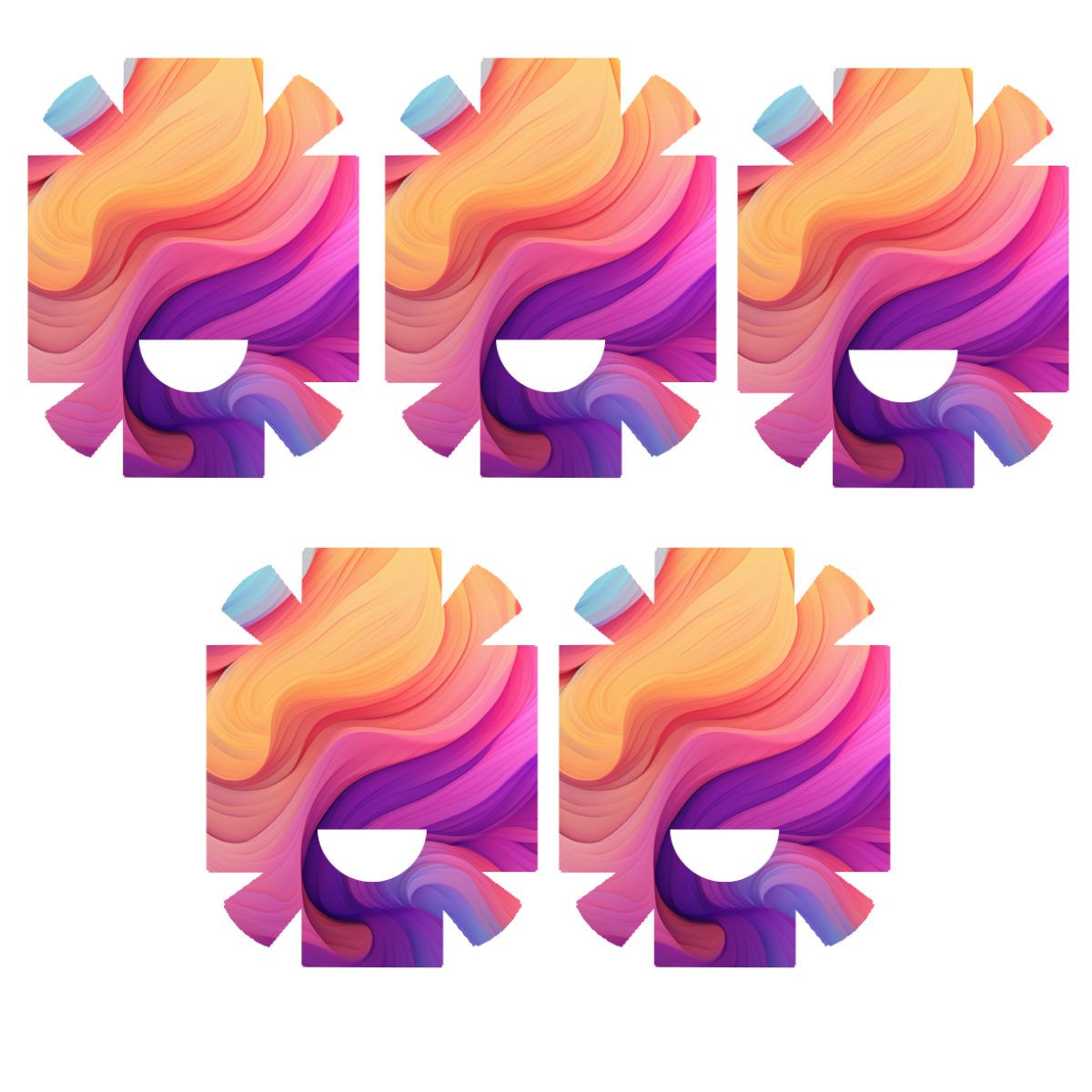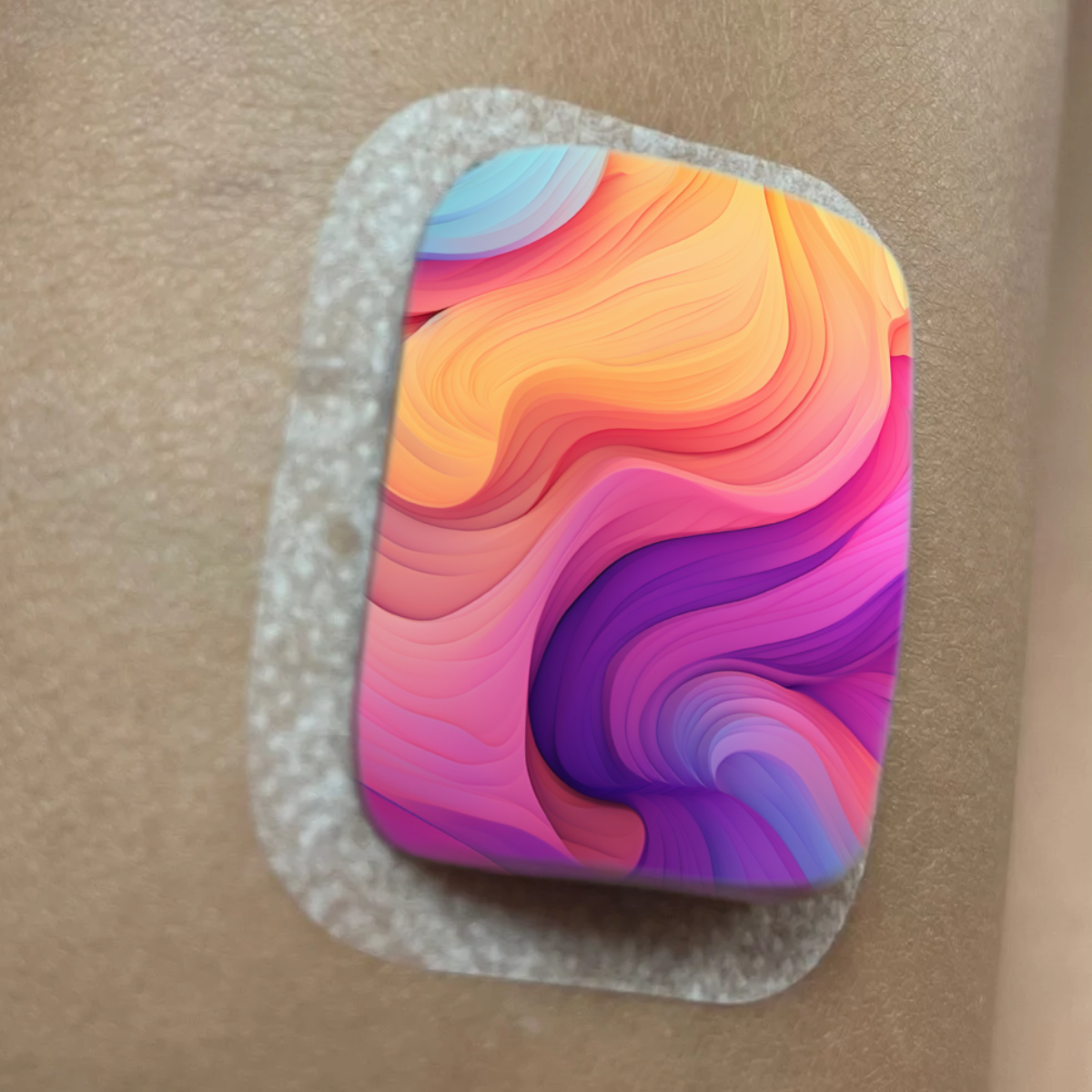 Abstraktse mustriga kleeps Medtrum Nano insuliinipumbale. Kleepsul on auk nõelaava kohal. Kleeps ulatub ka külgedele, kuid ei kata kõiki servi ideaalselt.