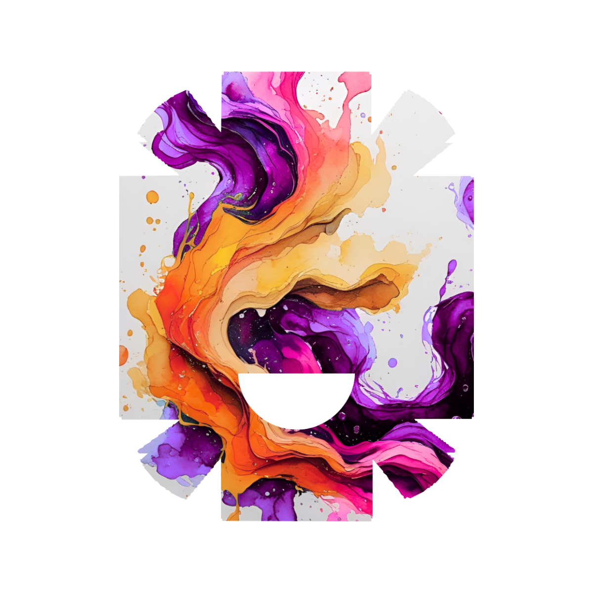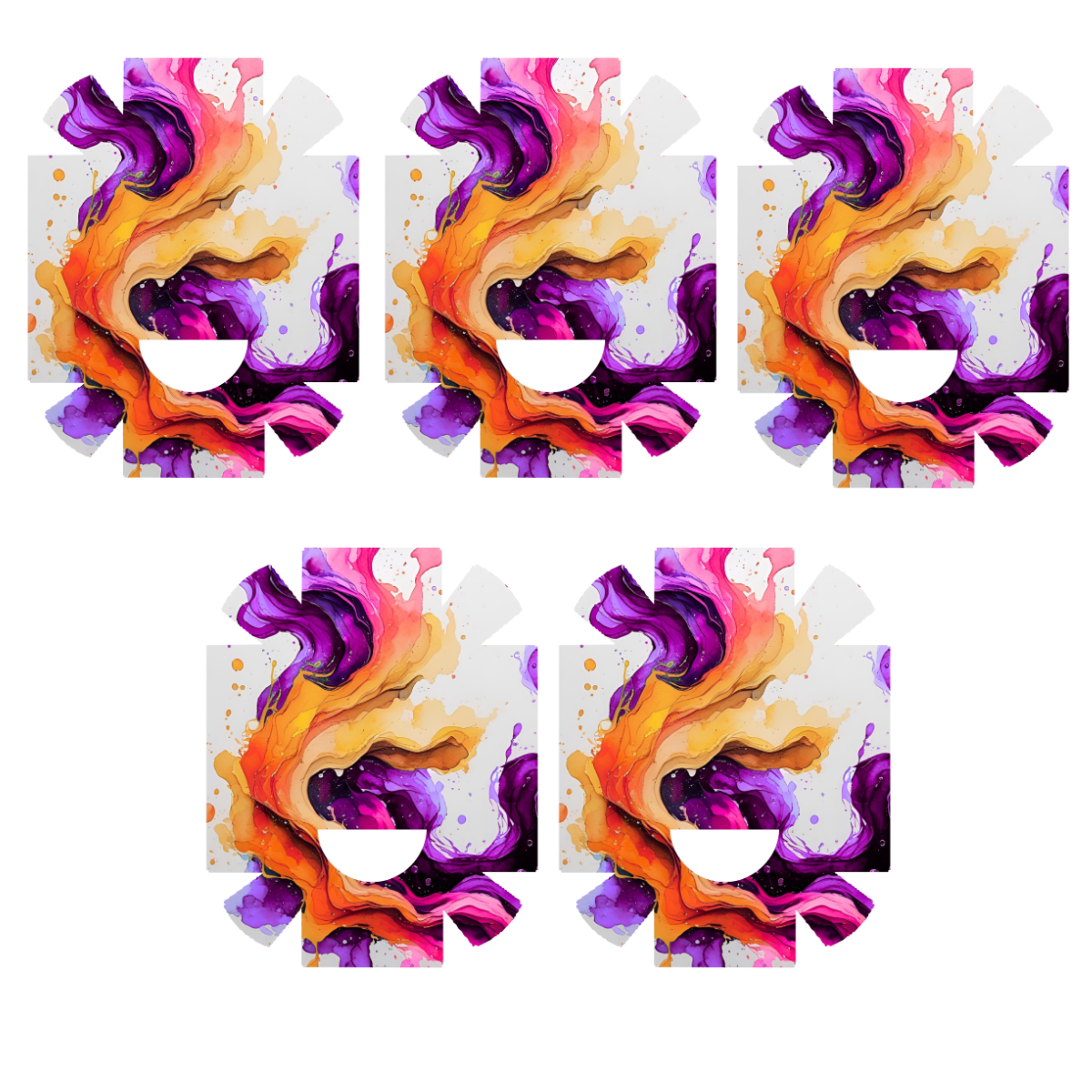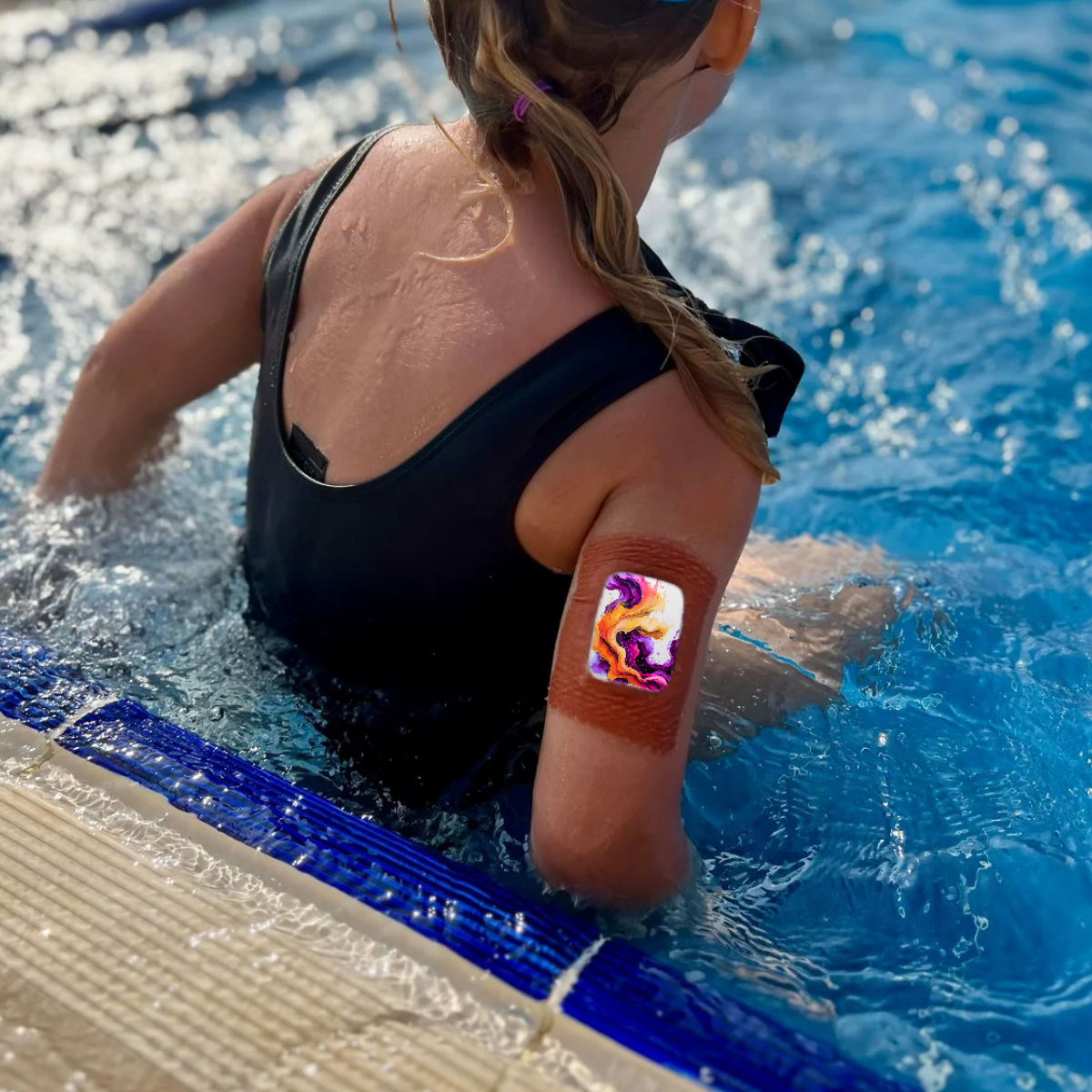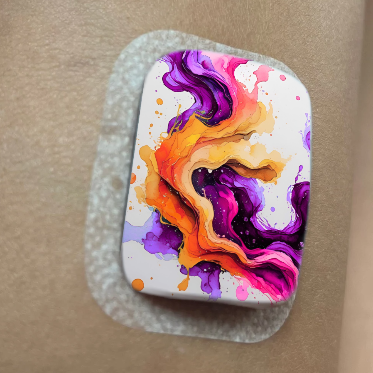 Abstraktse mustriga kleeps Medtrum Nano insuliinipumbale. Kleepsul on auk nõelaava kohal. Kleeps ulatub ka külgedele, kuid ei kata kõiki servi ideaalselt.