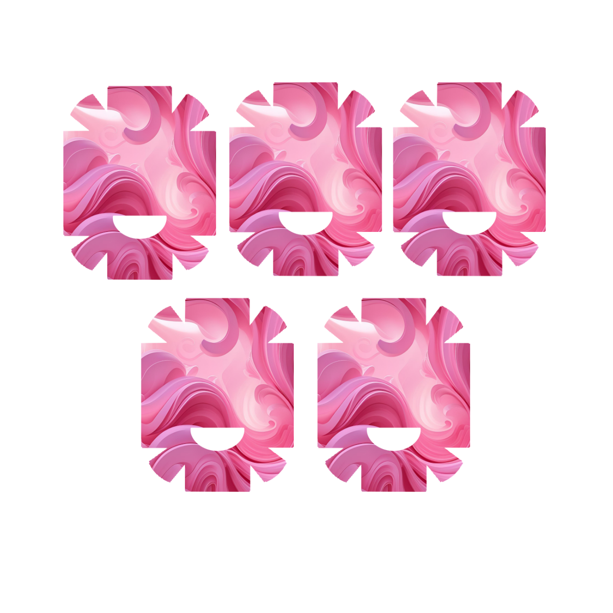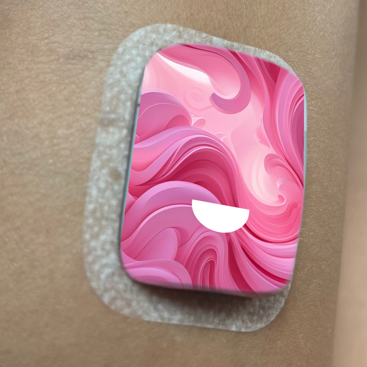Roosa abstraktse mustriga kleeps Medtrum Nano insuliinipumbale. Kleepsul on auk nõelaava kohal. Kleeps ulatub ka külgedele kuid ei kata kõiki servi ideaalselt.